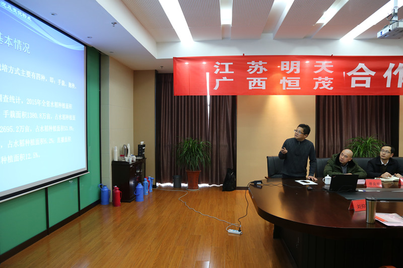 首先由江蘇明天種業胡董事長對廣西恒茂一行人的到來表示熱烈歡迎,然后由廣西恒茂曾良明經理做《通過“和系”組合實現切分長江中下游中秈市場宏愿》的報告,詳細闡述了“宏愿”以及“和系”的特點。然后由明天種業總經理助理蔣銀濤和鄒江石研究員聯合做了《栽培—品種推廣必修課》的報告,蔣總首先利用多個品種推廣實例論述了栽培的重要性,鄒江石研究員則利用“兩優培九”在全國的推廣歷程,具體而實際地論證了良種良法配套的必要性。與會人員經過多方面討論,一致認為通過推廣針對性的品種栽培小結來發揮品種優勢,做到“銷售有底氣”,同時公司應注意培養與“育繁推”一體化相對應的全能型人才,做到“營銷有力氣”。