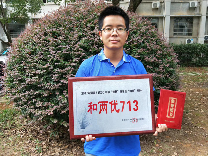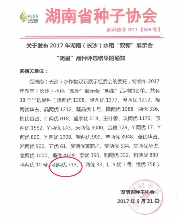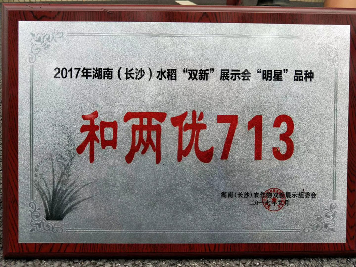 和兩優(yōu)713憑借其株型緊湊,劍葉上挺,畝有效穗高達(dá)24萬穗,桿青籽黃等一系列突出的田間表現(xiàn),脫穎而出,成功當(dāng)選2017年湖南水稻雙新展示會“明星”品種,并獲得由湖南農(nóng)作物雙新展示組委會頒發(fā)的榮譽(yù)證書。