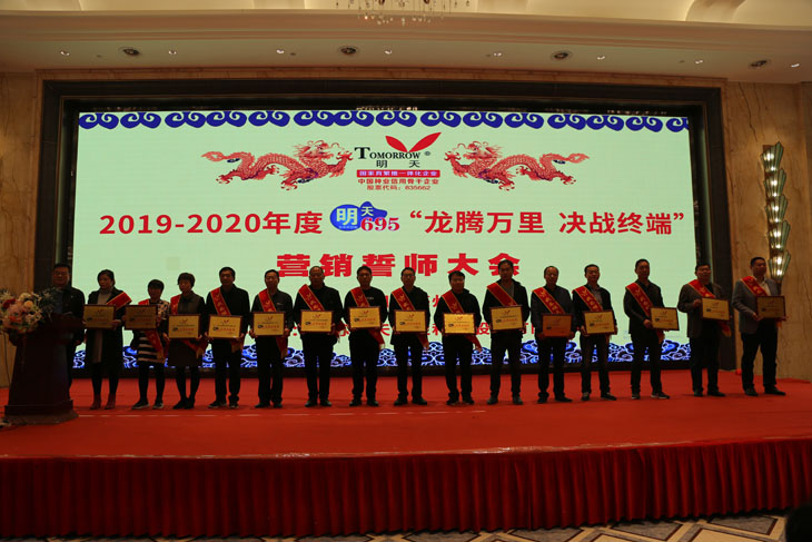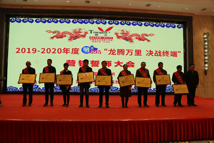 10:00時,“龍騰萬里 決戰(zhàn)終端”明天695營銷誓師大會在“明天695 九五至尊”的口號中拉開序幕。江蘇明天種業(yè)胡玉成副總經(jīng)理宣讀《關(guān)于評定明天695戰(zhàn)略合作伙伴等決定》,并由參會領(lǐng)導(dǎo)嘉賓對獲獎單位進行授牌頒獎。