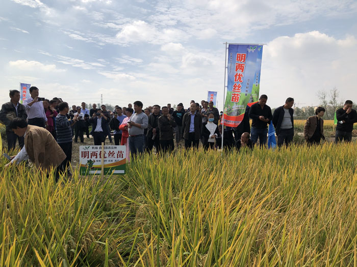 風吹楊柳盡,雨落稻花香。金秋十月,金黃的稻谷隨著秋風翻起金波,豐收在即。公司于10月8日-9日在江蘇省睢寧縣隆重召開明兩優絲苗田間觀摩會議。參加會議有江蘇明天種業科技股份有限公司副總經理王波、總經理助理楊海波及公司代表,睢寧縣明兩優絲苗核心代理商彭奔、各縣市經銷商、種植大戶、育秧合作社代表共計100余人參加會議。
